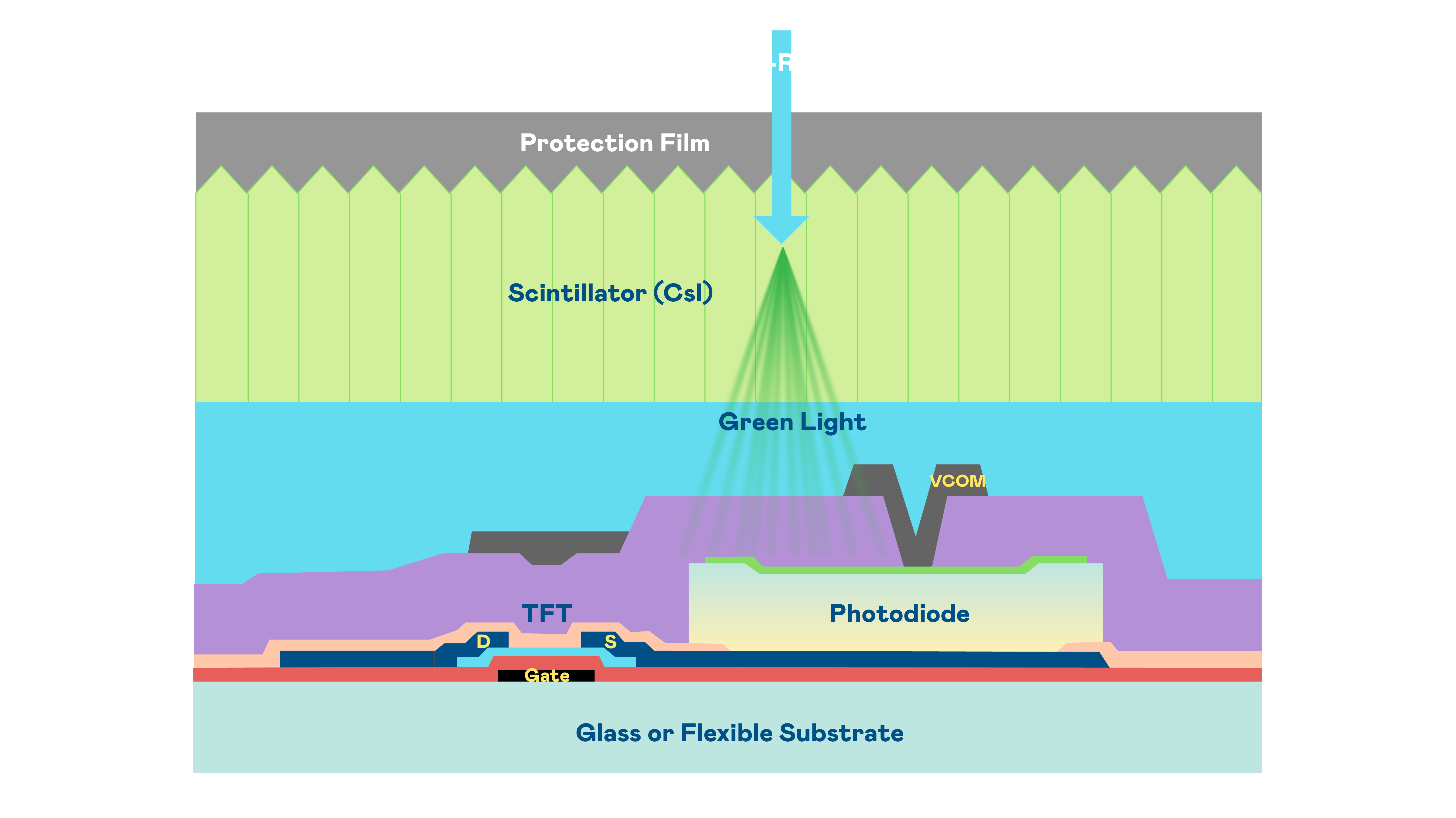 伟德国际1946的X光影像感测阵列使用薄膜电晶体 (TFT) 作为每个像素的读取开关,搭配光电二极体(Photodiode)的光电转换元件,用以感测X光影像讯号。